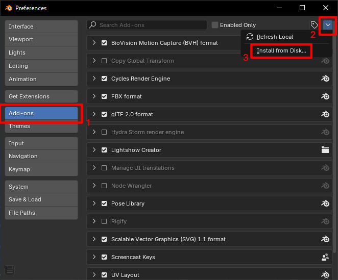* Try closing and opening Blender, and try enabling Lightshow Creator again.